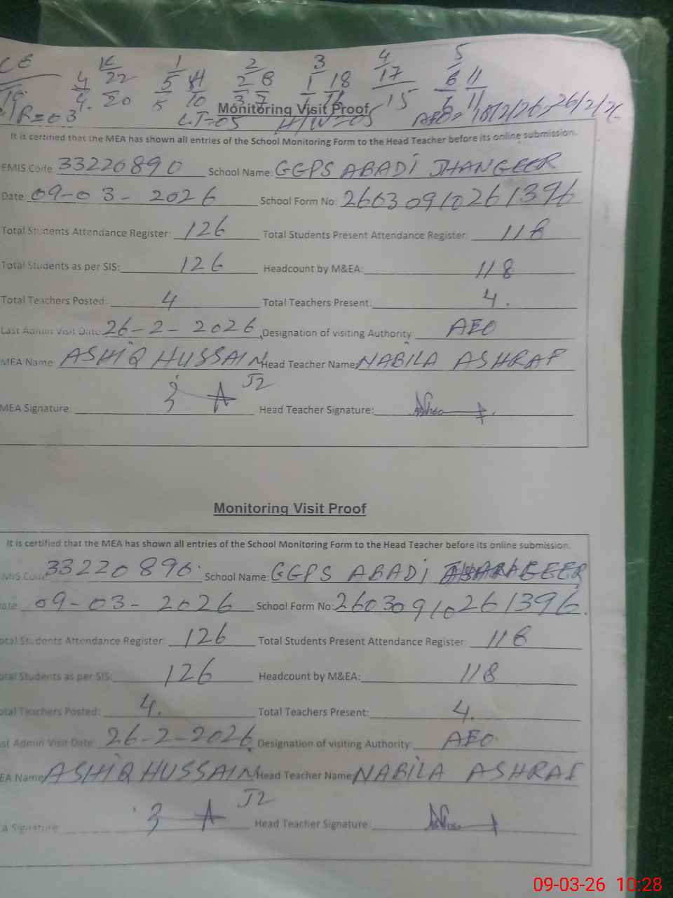 | Attendance Register | Head Teacher | MEA with School | Visit Proof |