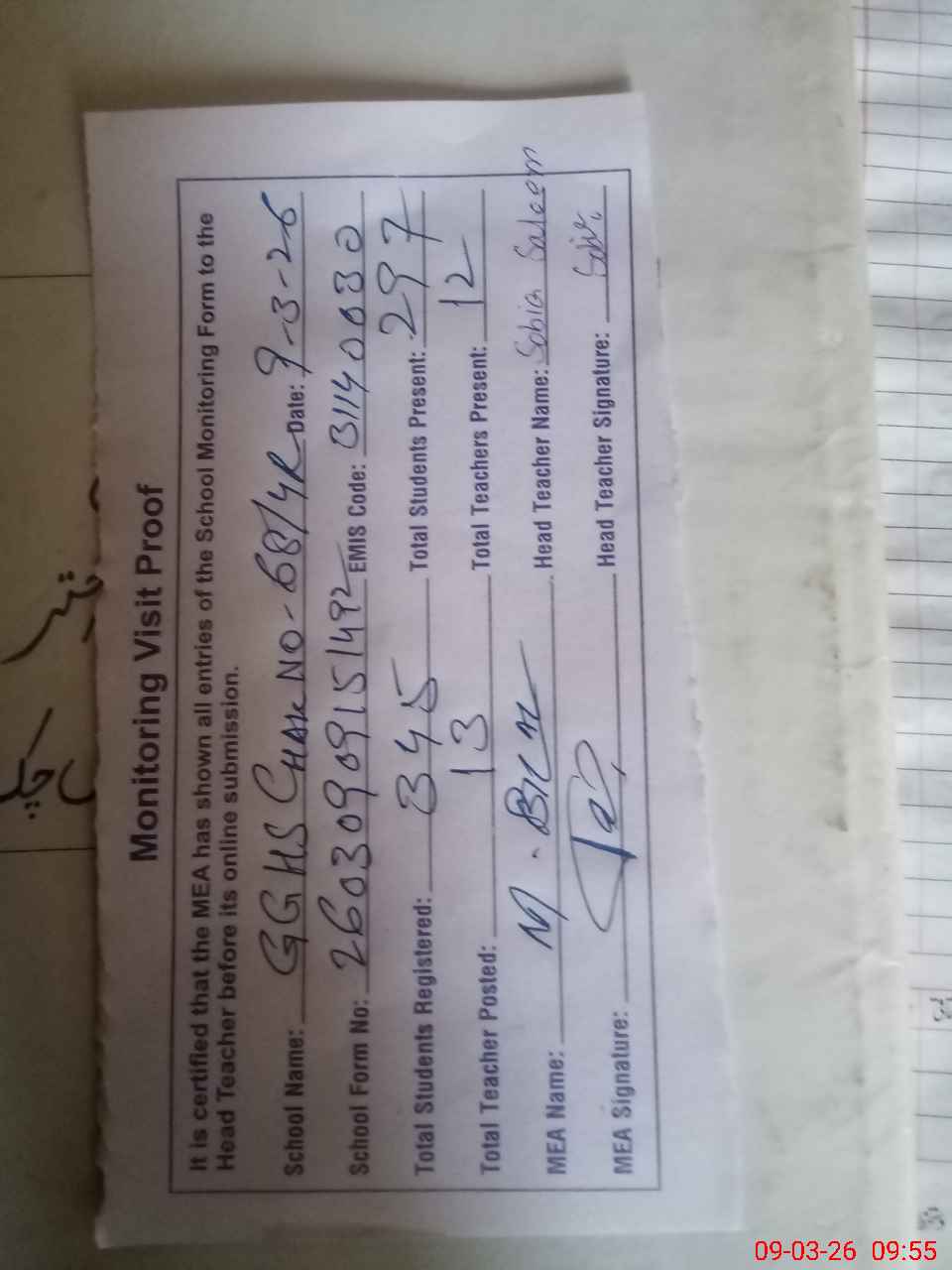 | Attendance Register | Head Teacher | MEA with School | Visit Proof |