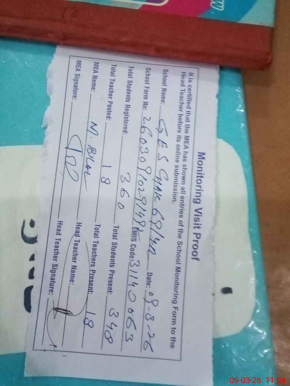 | Attendance Register | Head Teacher | MEA with School | Visit Proof |