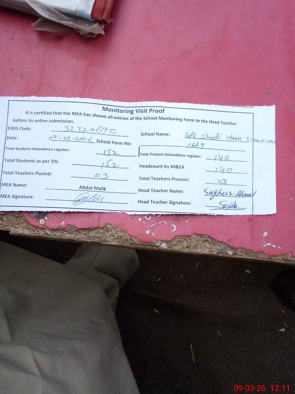 | EMIS Code: 32320690 | Name of School: GPS SHADI KHAN SINAWAN | |||