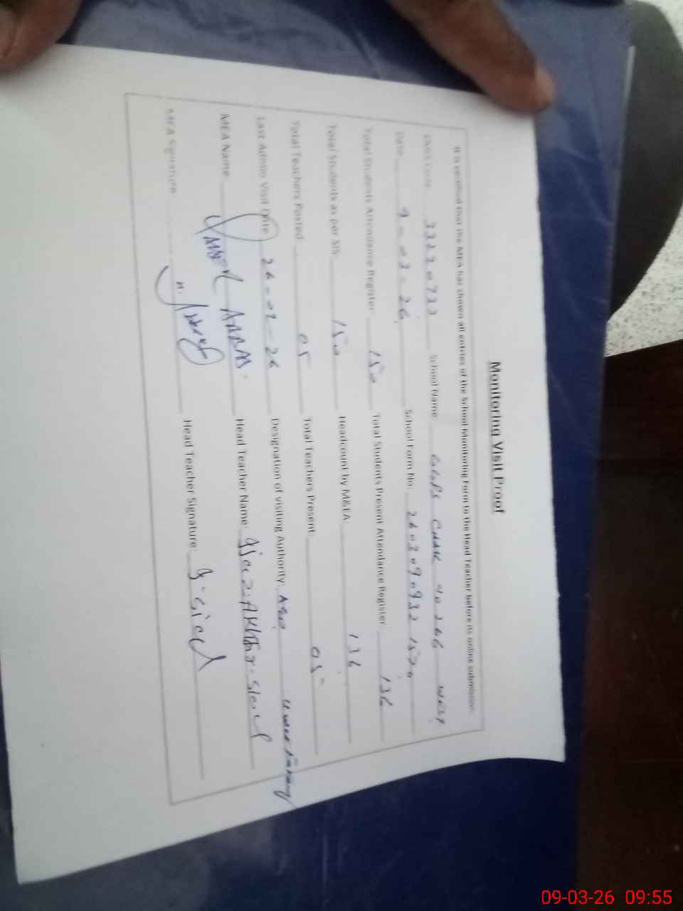 | Attendance Register | Head Teacher | MEA with School | Visit Proof |