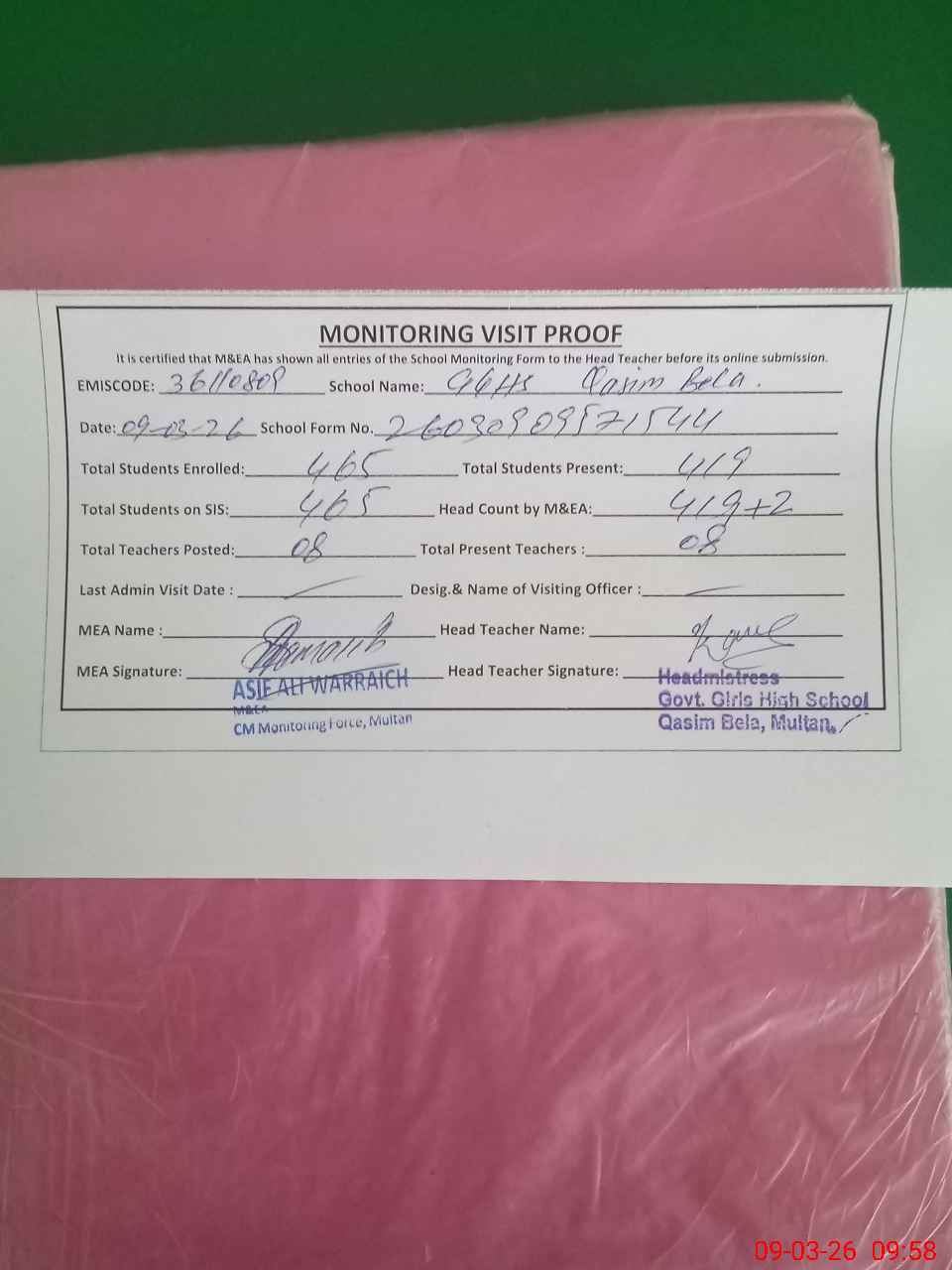 | EMIS Code: 36110809 | Name of School: GGHS QASIM BELA MULTAN | |||