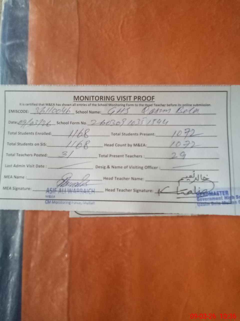 | Attendance Register | Head Teacher | MEA with School | Visit Proof |