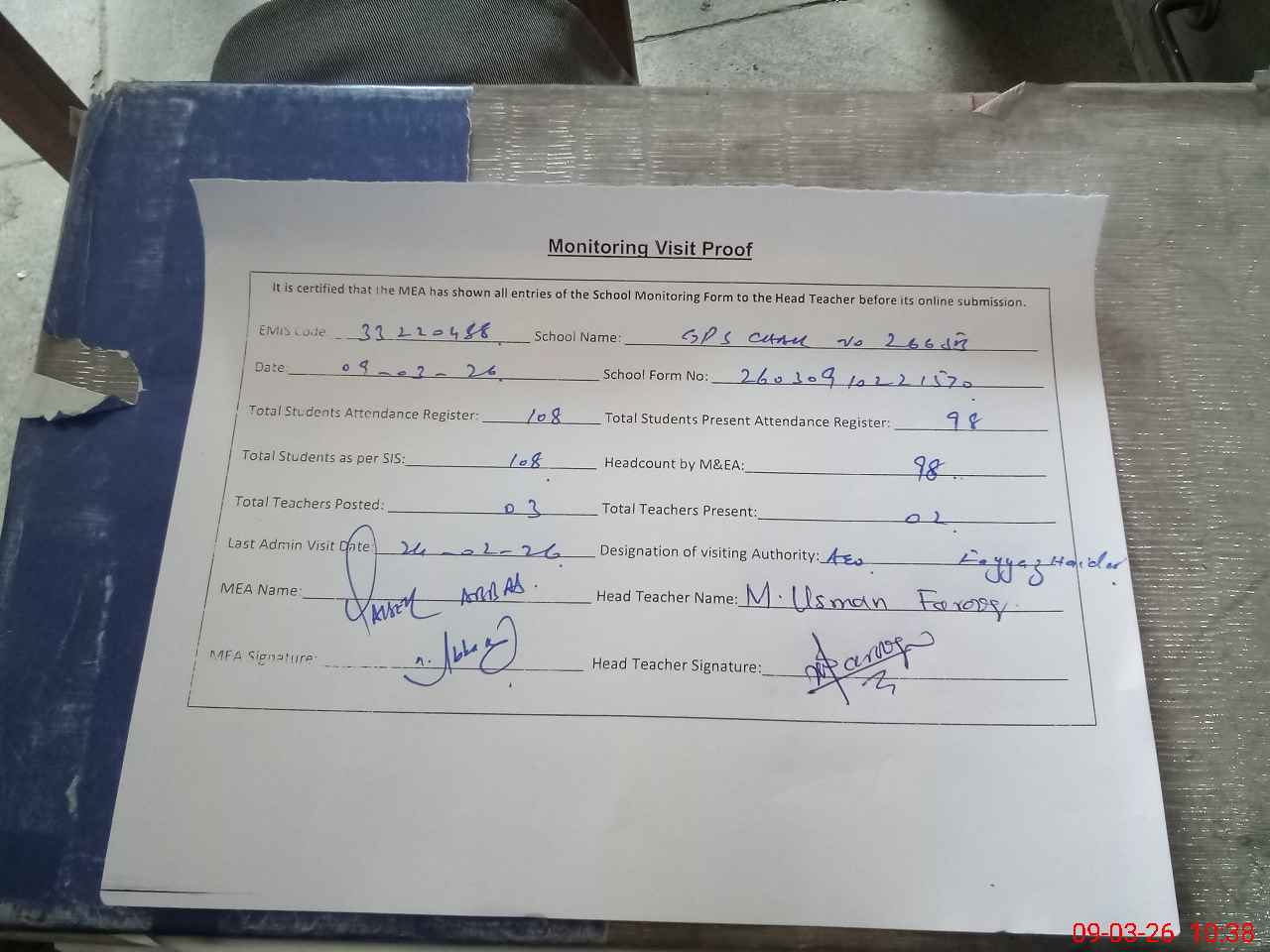 | EMIS Code: 33220488 | Name of School: GPS CHAK NO. 266 JB | |||