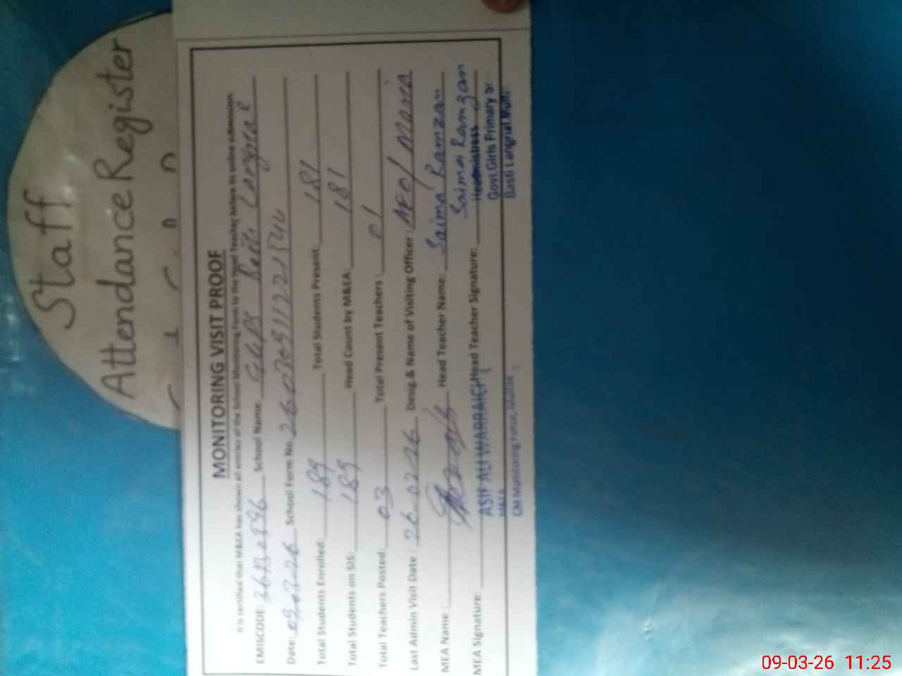 | Attendance Register | Head Teacher | MEA with School | Visit Proof |