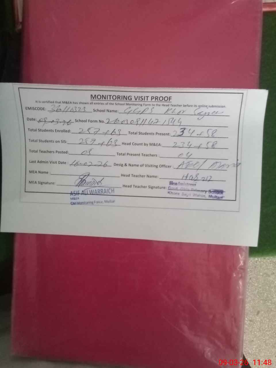 | Attendance Register | Head Teacher | MEA with School | Visit Proof |