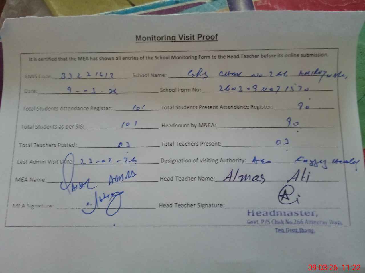 | EMIS Code: 33221413 | Name of School: GPS CHAK NO 266 AMIREY WALA | |||