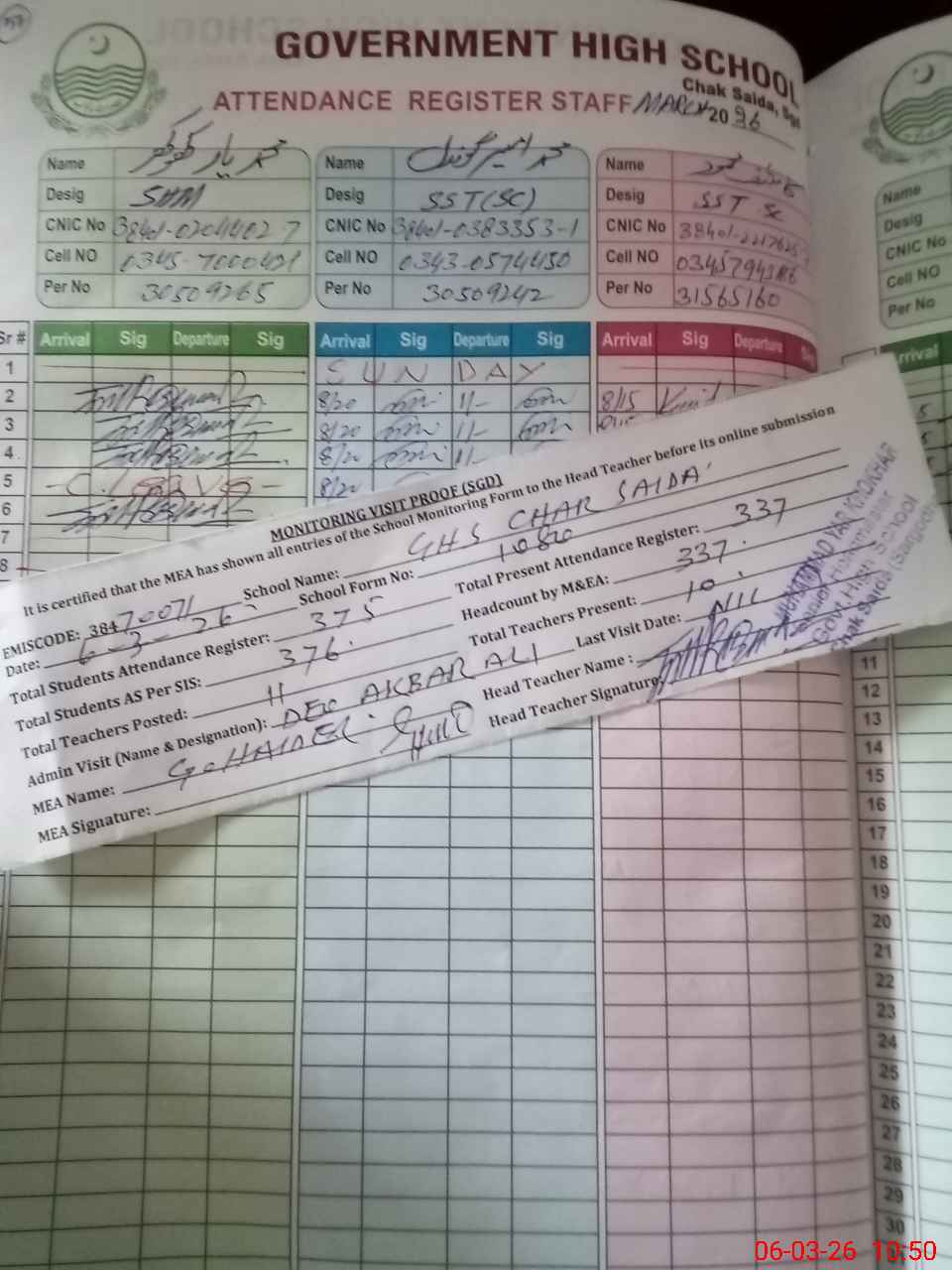 | Attendance Register | Head Teacher | MEA with School | Visit Proof |
