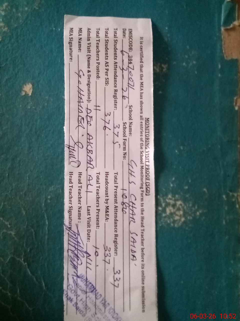 | Certified that this School was Inspected by the Undersigned MEA/DMO Today and the Information Stated Above is as Per Record. | |||||