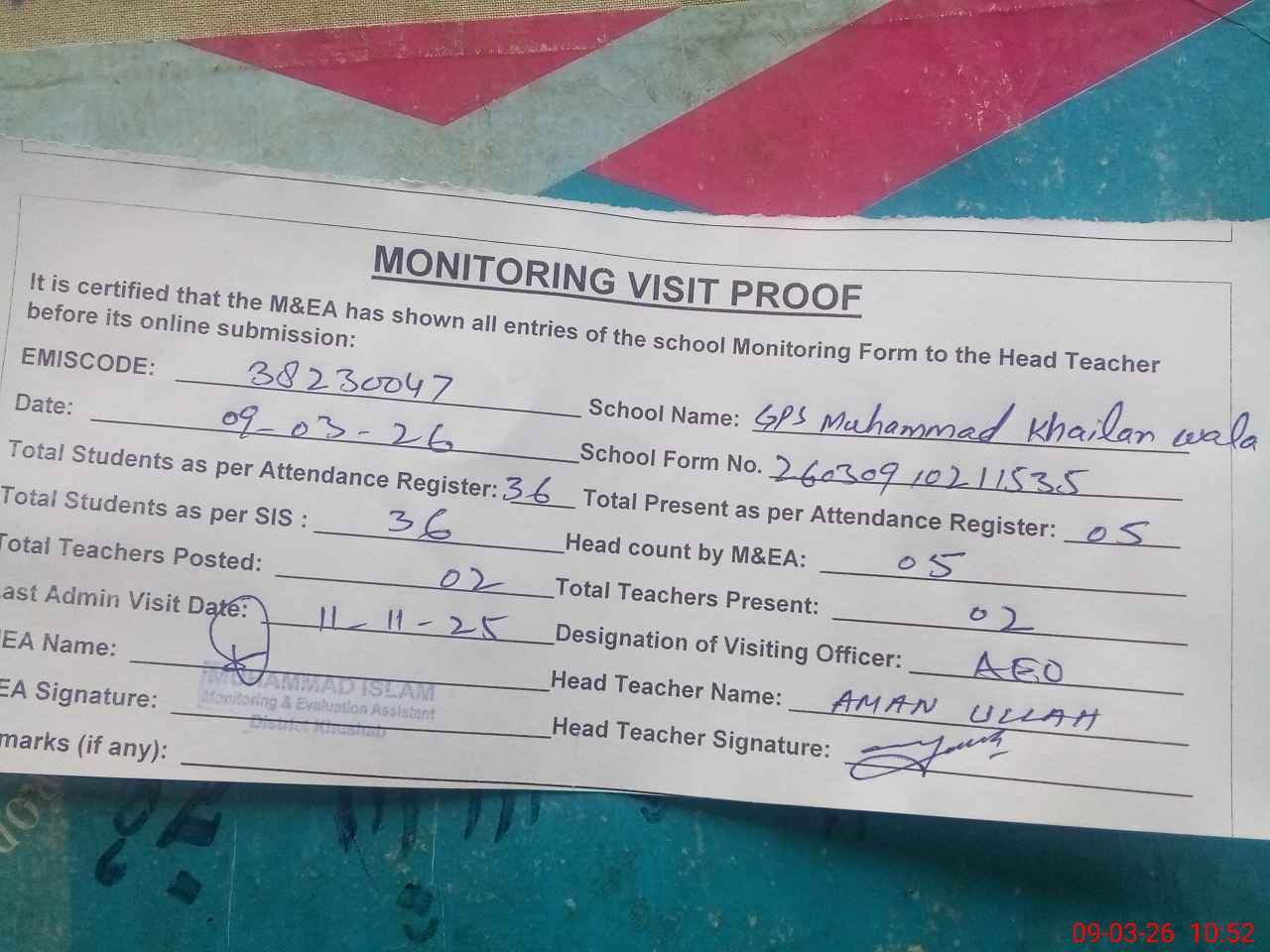 | Remarks (Use Separate Page if Required): AEO visited school on 11 November 2025 students strength on sis 36 students attendance register shows that most students left the school and daily presence is 5 to 7 students only whole school building is in dangerous condition | |||||