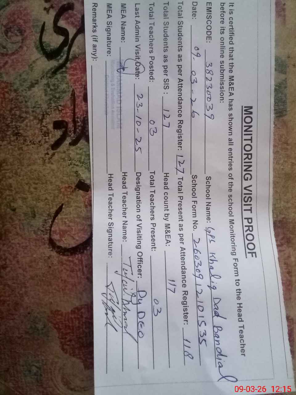 | Remarks (Use Separate Page if Required): Dy DEO visited school on 23 October 2025 as per teacher attendance register but visit not mark on log book students strength on sis 127 | |||||