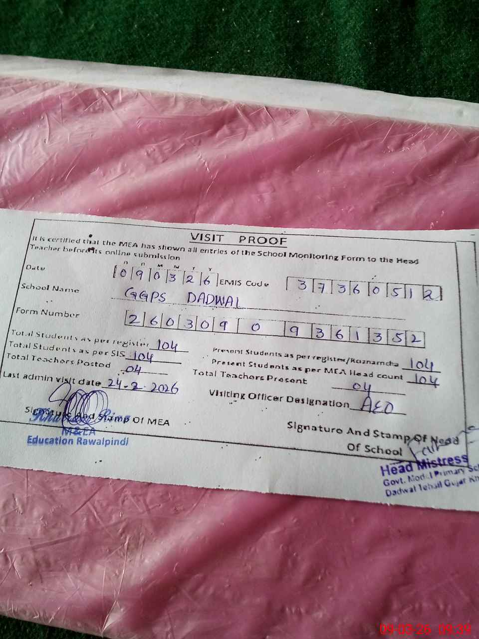 | Certified that this School was Inspected by the Undersigned MEA/DMO Today and the Information Stated Above is as Per Record. | |||||