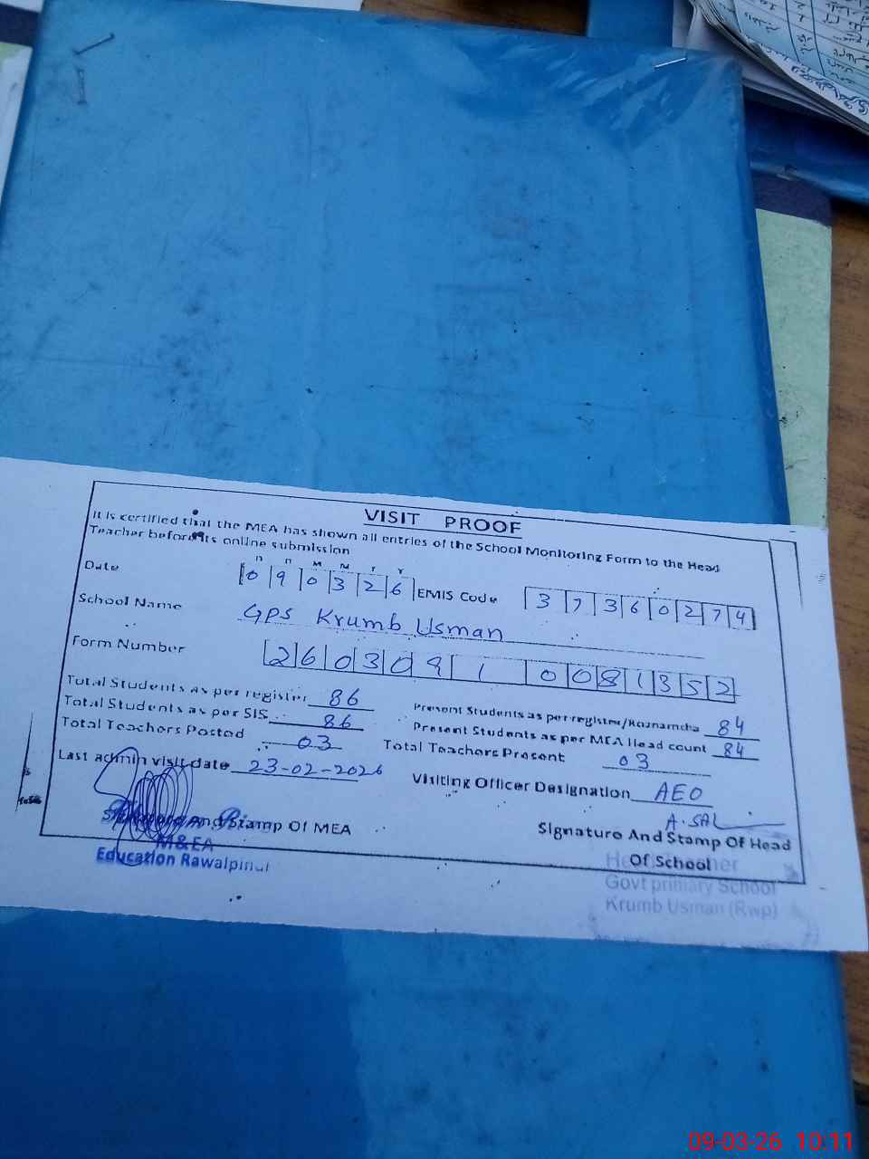 | Attendance Register | Head Teacher | MEA with School | Visit Proof |