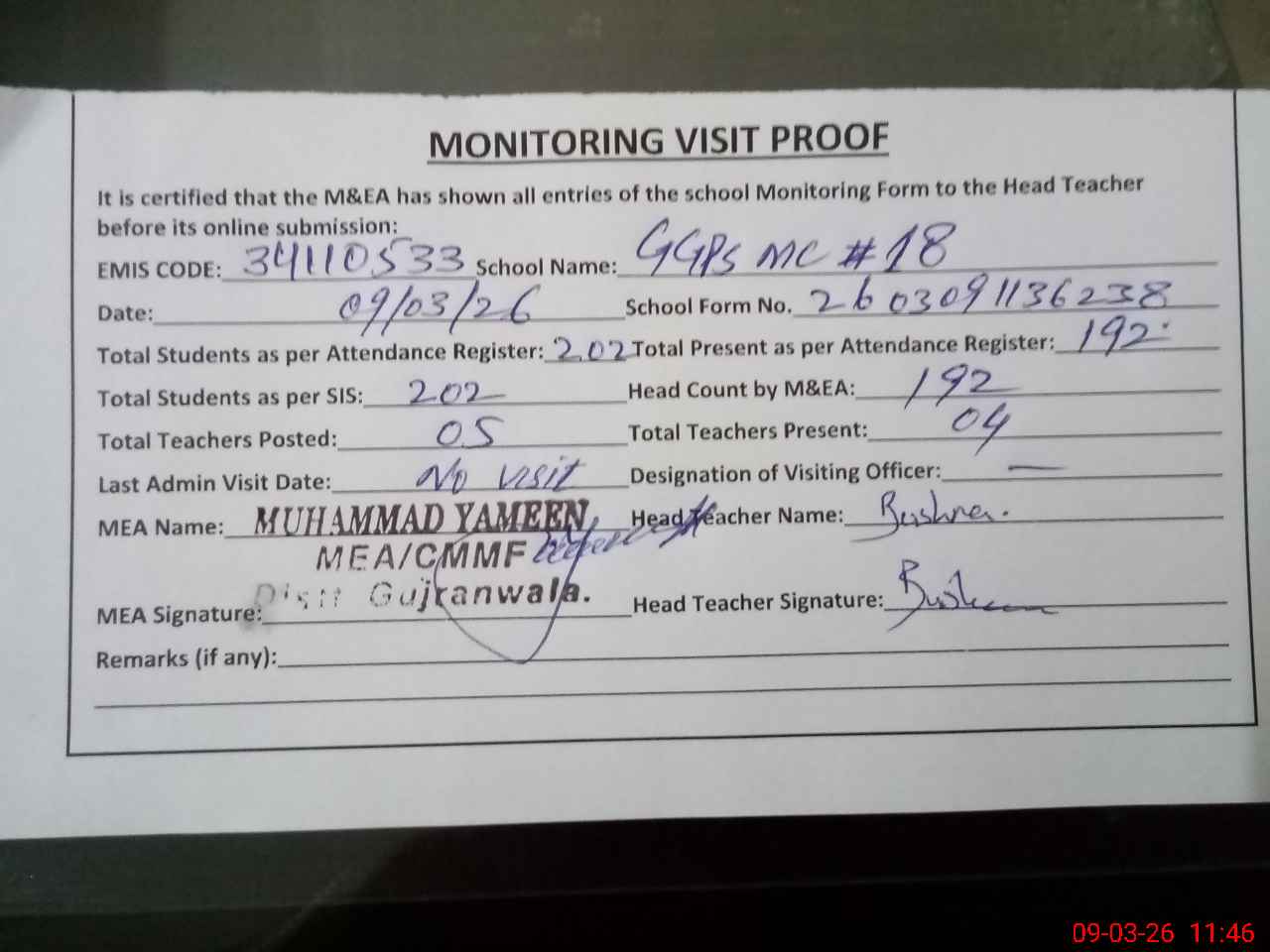 | Attendance Register | Head Teacher | MEA with School | Visit Proof |