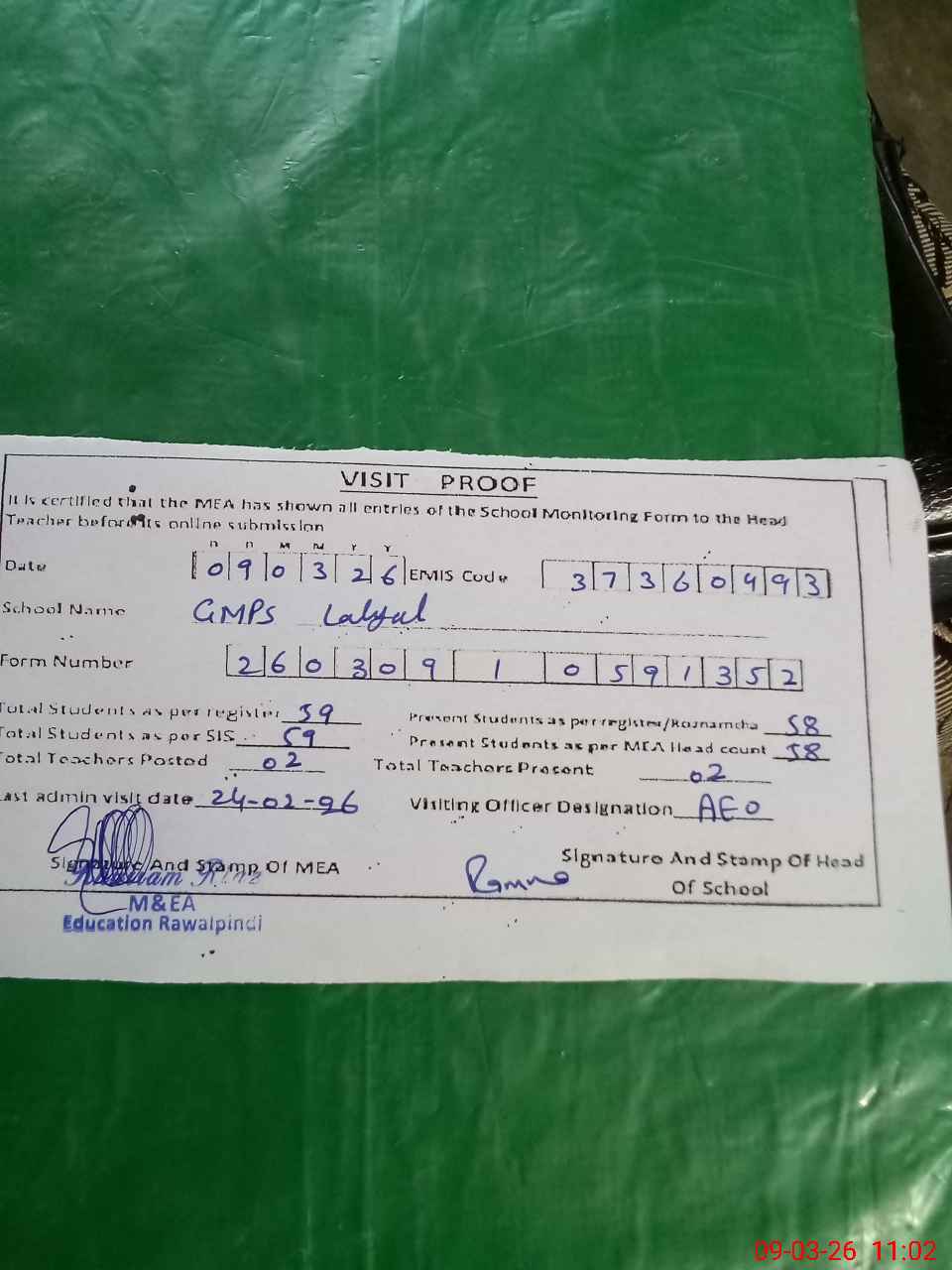 | Attendance Register | Head Teacher | MEA with School | Visit Proof |