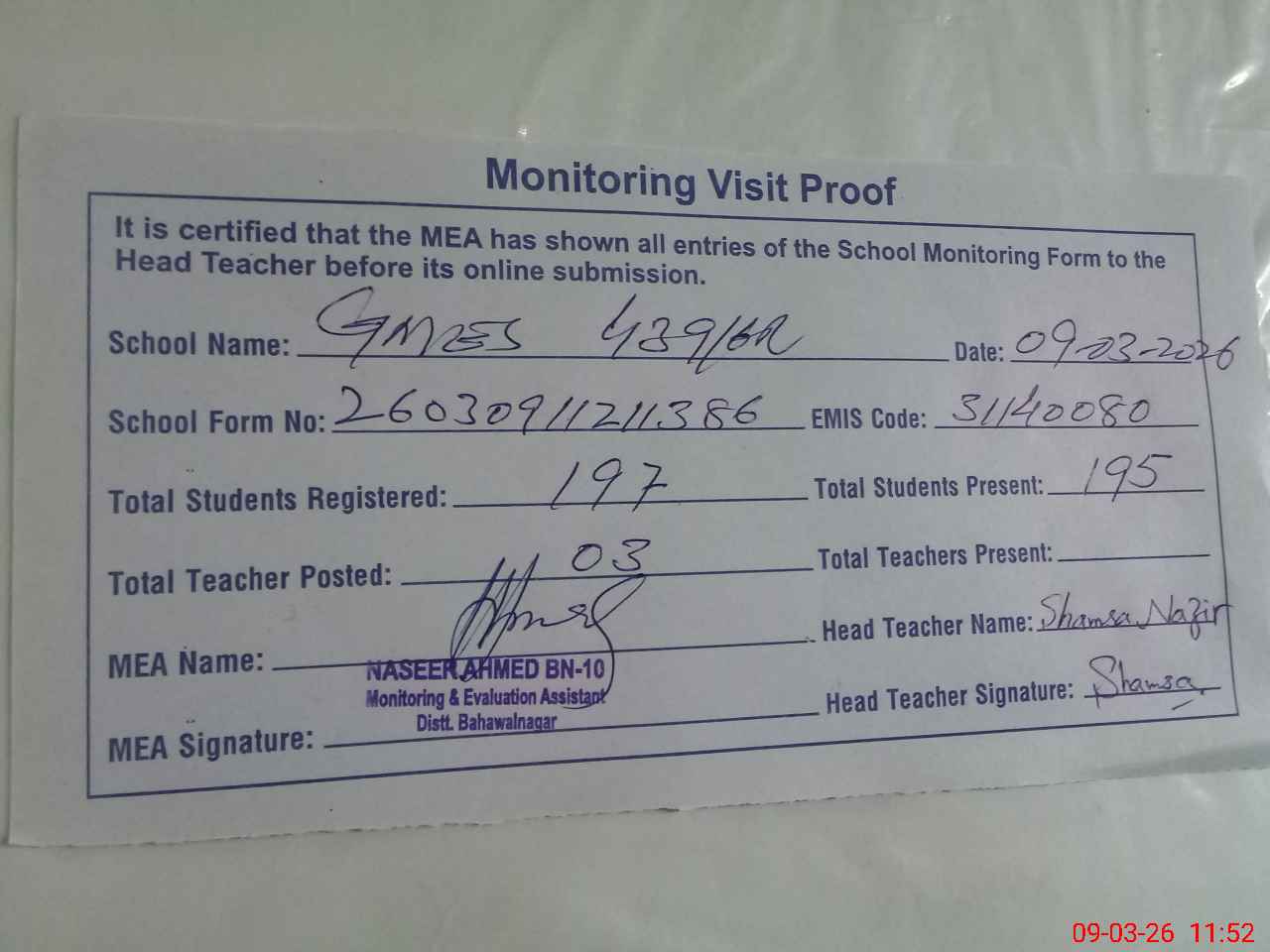 | Attendance Register | Head Teacher | MEA with School | Visit Proof |