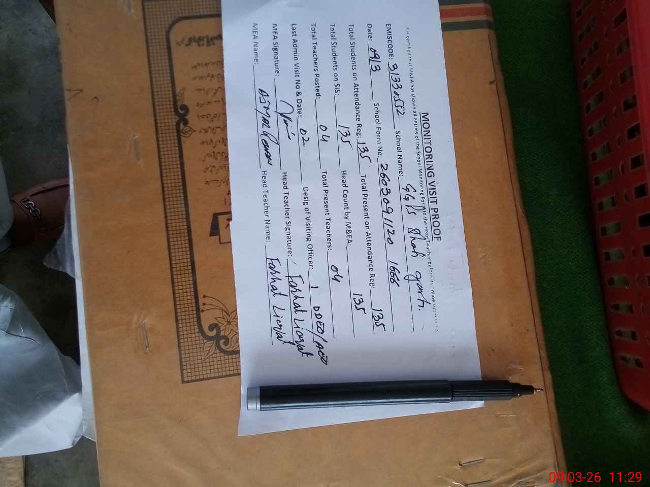 | Attendance Register | Head Teacher | MEA with School | Visit Proof |