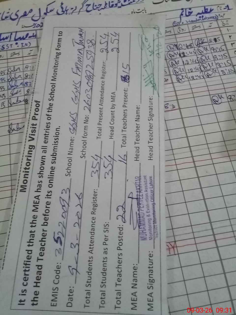 | Monitoring Date: 09-03-2026 | Start Time: 09-03-2026 08:47 AM | End Time: 09-03-2026 09:31 AM | Name of MEA: M.**** AK**** | |