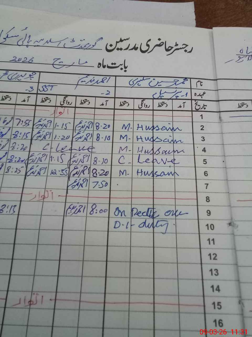 | 35**** | Mu**** Hu**** | SSS (Physical Education) | Regular | 0 | 0 | 0 | 0 | 0 | 0 | 0 | 0 | 0 | Absent (Un-Authorized) |