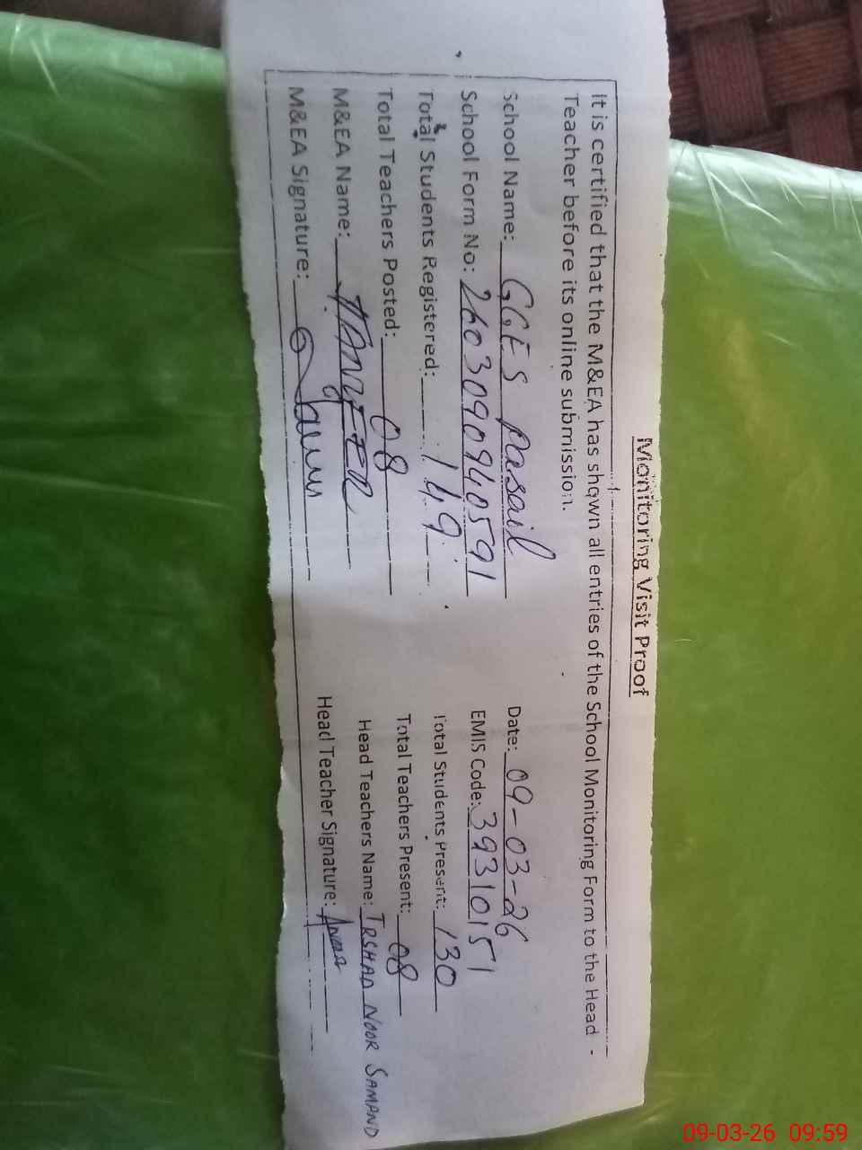 | Attendance Register | Head Teacher | MEA with School | Visit Proof |
