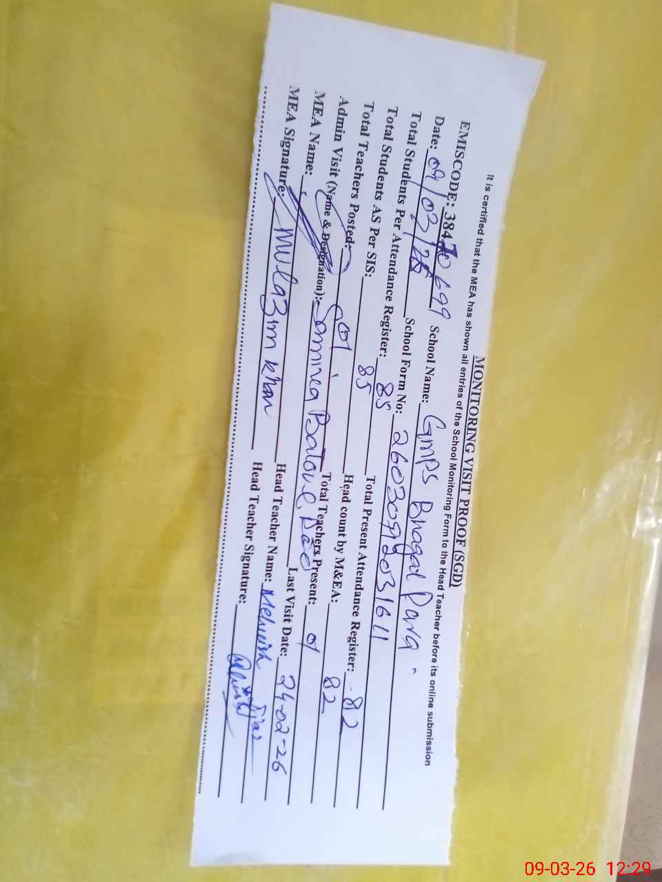 | Attendance Register | Head Teacher | MEA with School | Visit Proof |