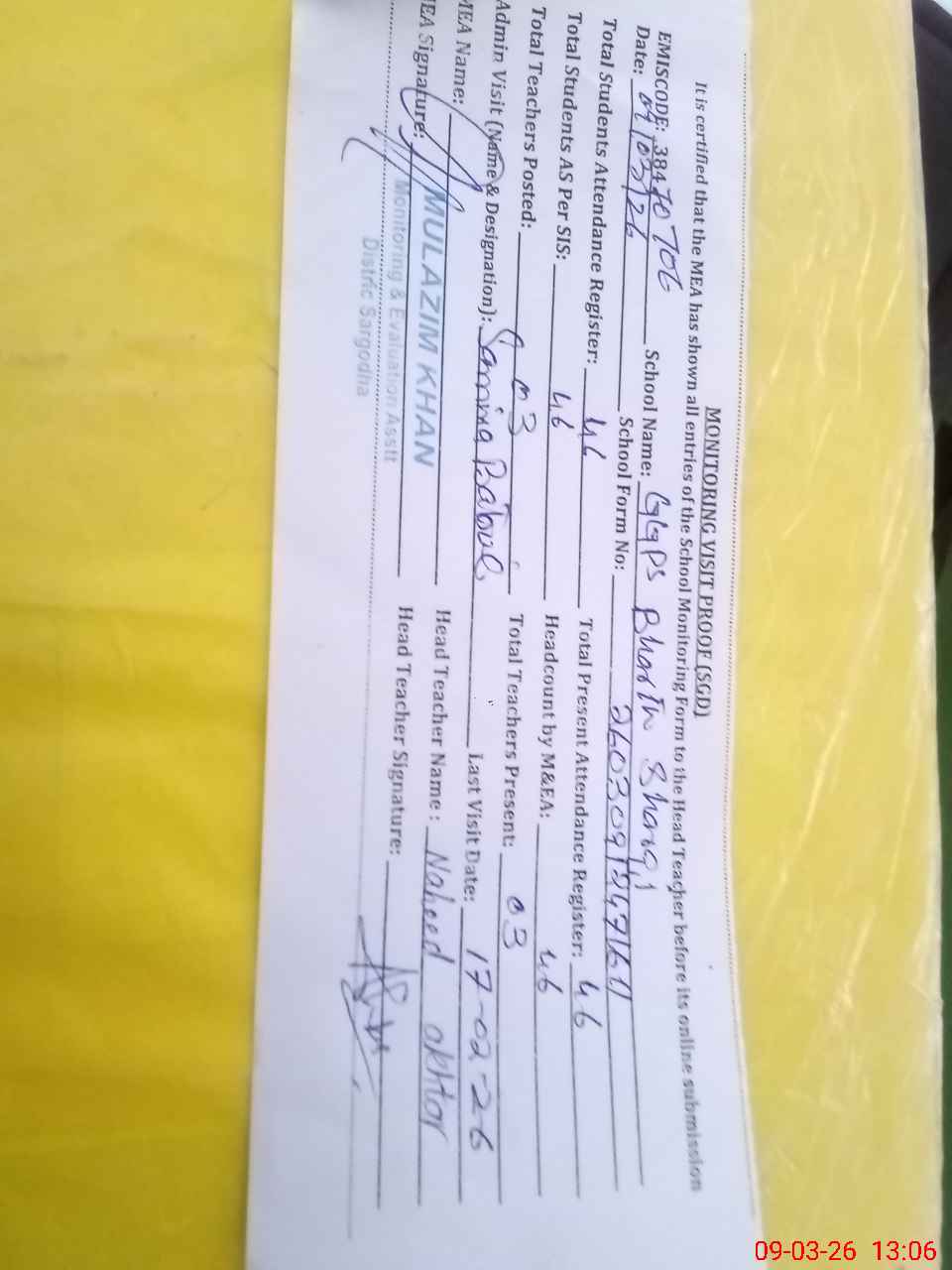 | Attendance Register | Head Teacher | MEA with School | Visit Proof |