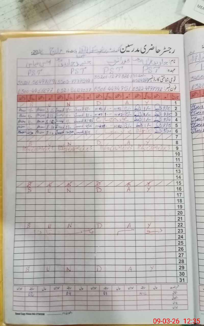 | 35**** | Mu**** Qa**** Bu**** | PST Arts | Regular | 0 | 0 | 0 | 0 | 0 | 0 | 0 | 0 | 0 | Exam Duty |