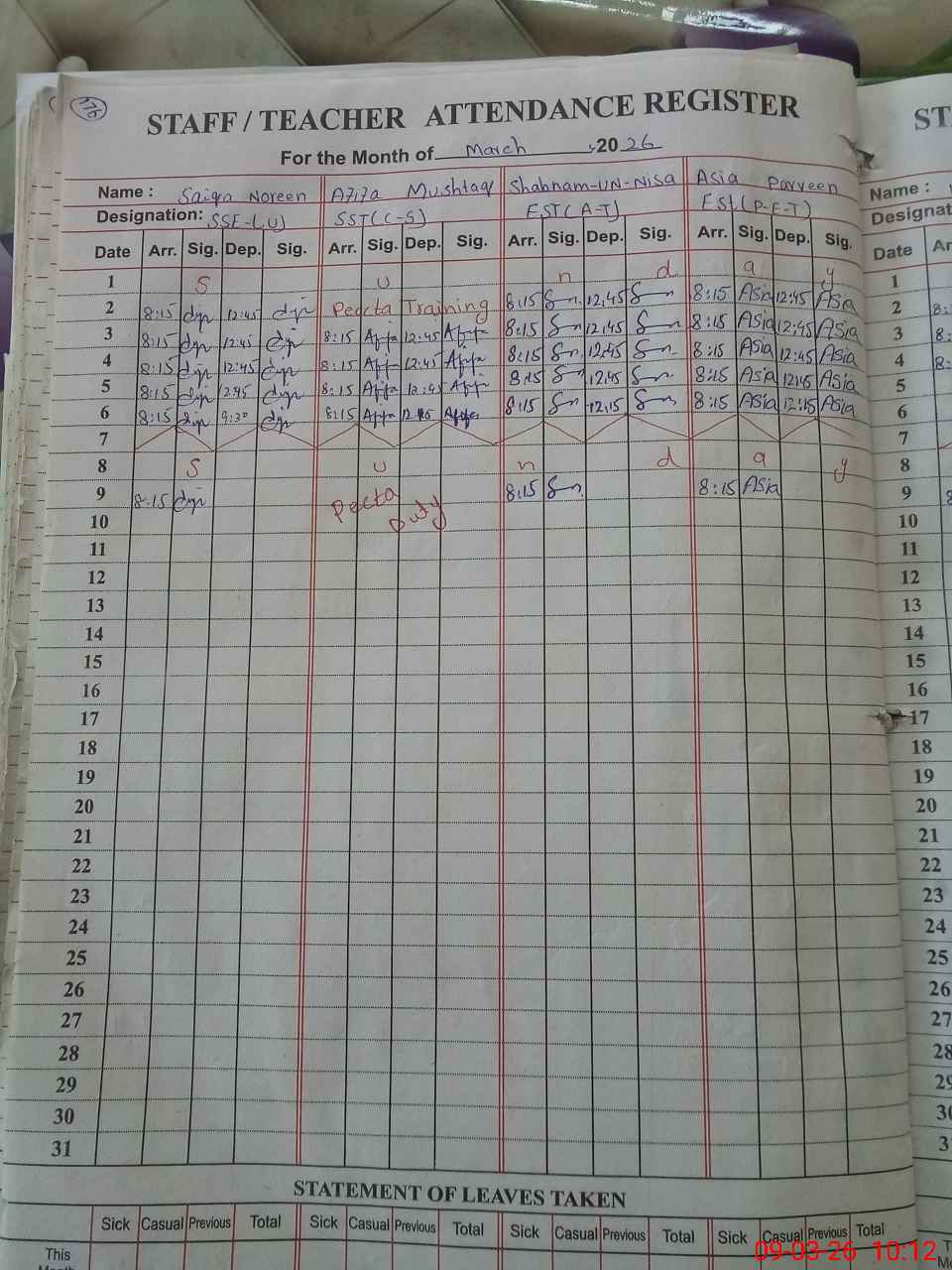 | 37**** | Sa**** Ja**** | PST Arts | Regular | 0 | 0 | 0 | 0 | 0 | 0 | 0 | 0 | 0 | Exam Duty |