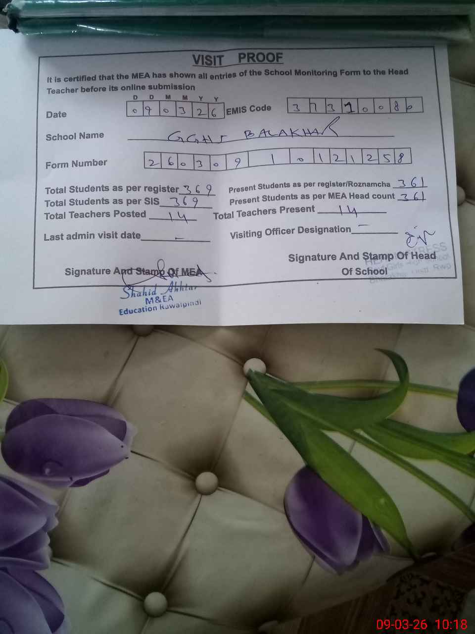 | Attendance Register | Head Teacher | MEA with School | Visit Proof |