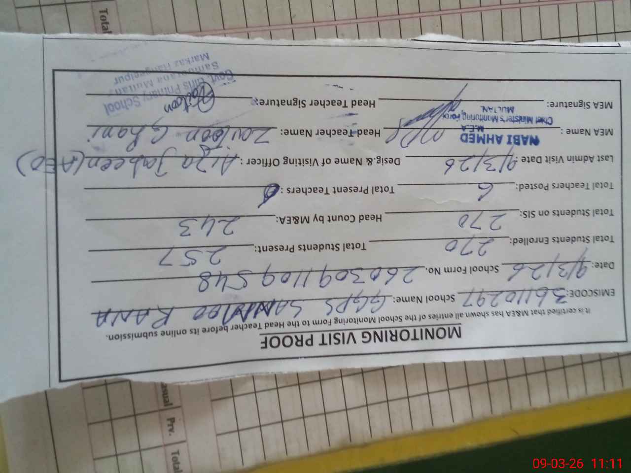 | Certified that this School was Inspected by the Undersigned MEA/DMO Today and the Information Stated Above is as Per Record. | |||||