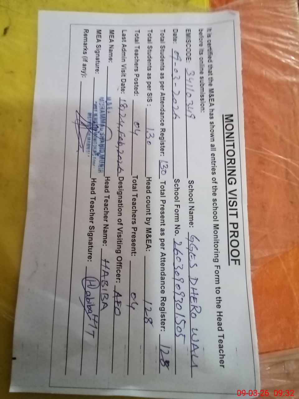 | Attendance Register | Head Teacher | MEA with School | Visit Proof |
