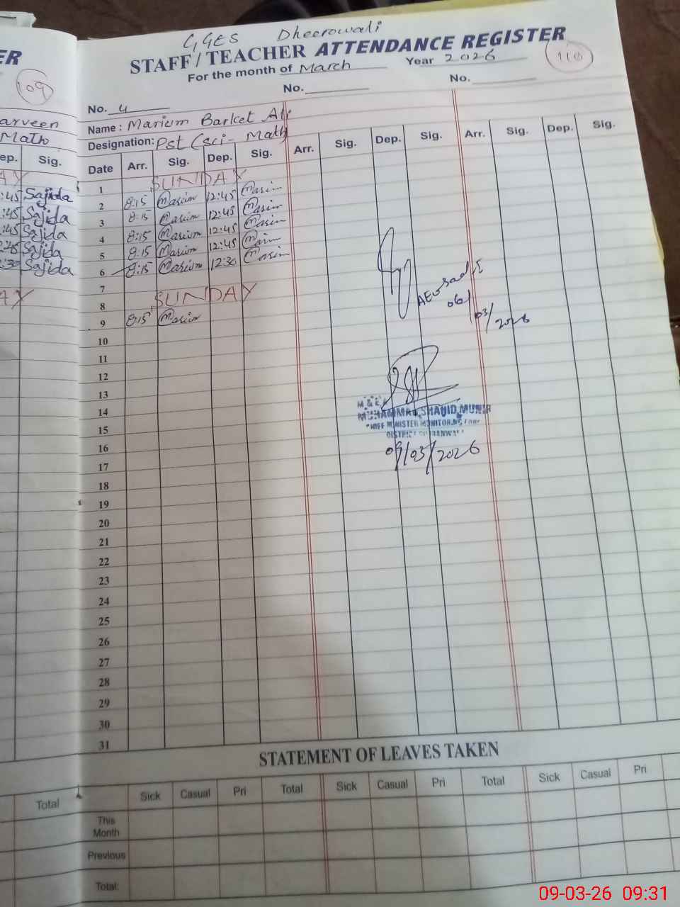 | Monitoring Date: 09-03-2026 | Start Time: 09-03-2026 08:55 AM | End Time: 09-03-2026 09:34 AM | Name of MEA: S-**** Sh**** Mu**** | |
