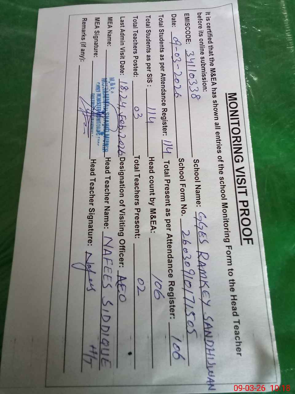 | Attendance Register | Head Teacher | MEA with School | Visit Proof |