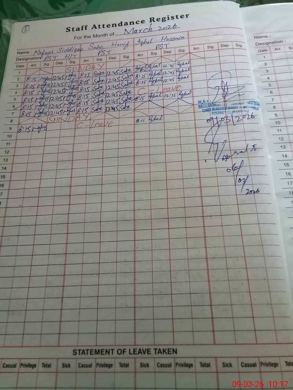 | CNIC | Full Name | Designation | R/C | Absence During Last Calender Month |