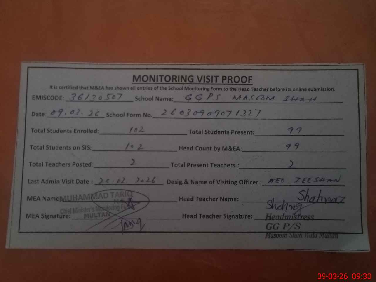 | EMIS Code: 36130507 | Name of School: GGPS MASOOM SHAH WALA | |||