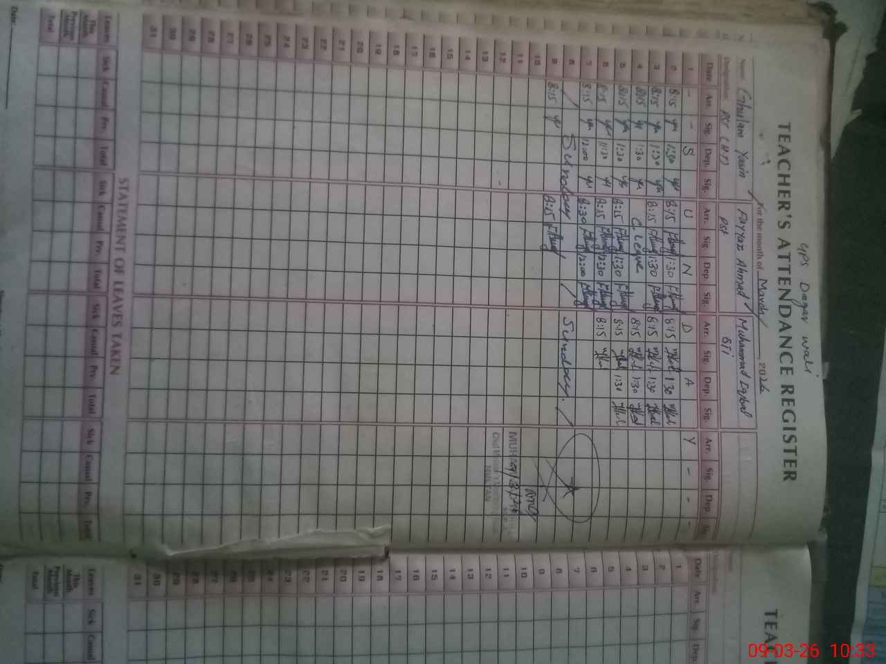 | Remarks (Use Separate Page if Required): PST FAYYAZ AHMAD USING MOBILE PHONE IN SCHOOL SOME NAME HELD IN STUDENTS ATTENDENCE LIST NOT AVAILABLE ON STUDENTS ATTENDENCE REGISTER NURSERY CLASS GIRLS ATTENDENCE NOT BEING MARKED ON STUDENTS ATTENDENCE REGISTER SINCE START OF THE MONTH STUDENTS STRENGTH NOT MATCHED WITH SIS ROZNAMCHA AND STUDENTS ATTENDENCE REGISTERS | |||||