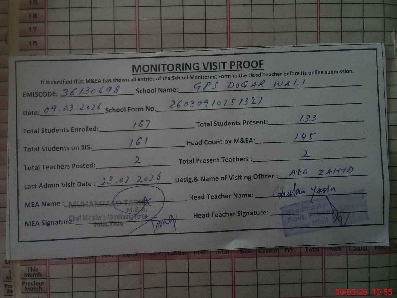 | Attendance Register | Head Teacher | MEA with School | Visit Proof |