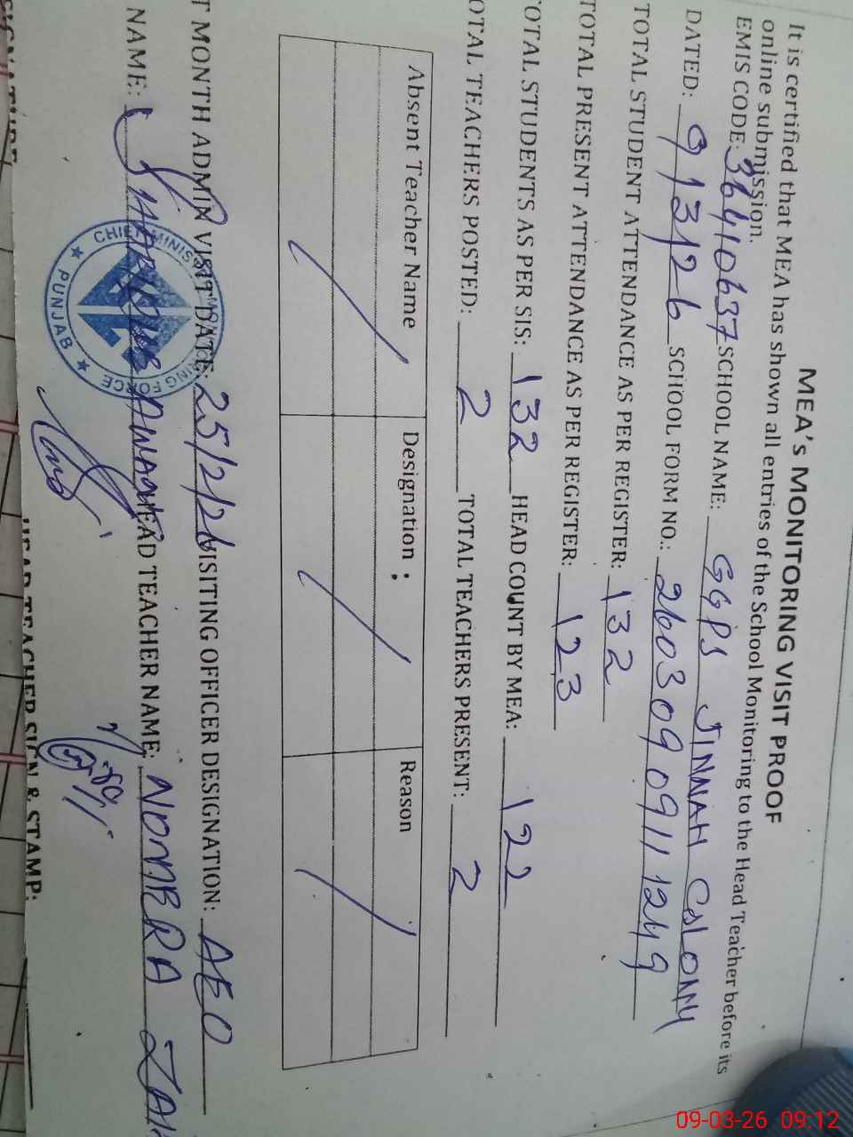 | Attendance Register | Head Teacher | MEA with School | Visit Proof |
