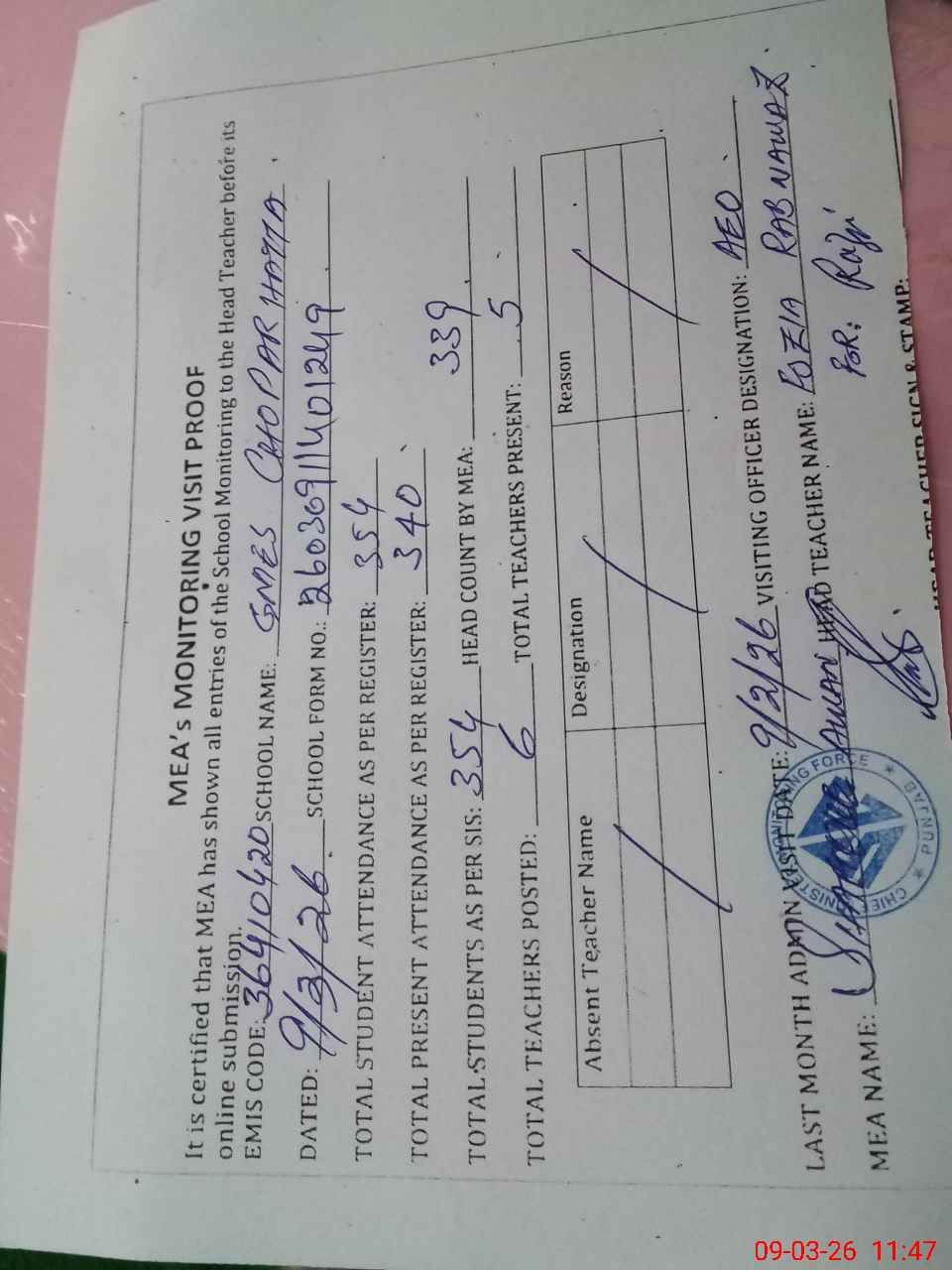 | Attendance Register | Head Teacher | MEA with School | Visit Proof |