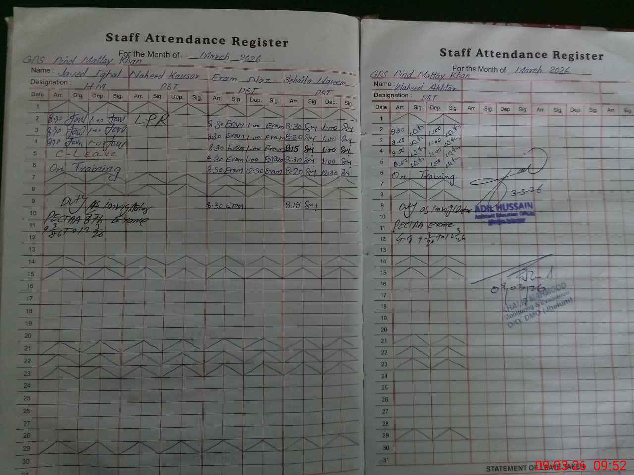 | 37**** | Wa**** Ak**** | PST Arts | Regular | 0 | 0 | 0 | 0 | 0 | 0 | 0 | 0 | 0 | Exam Duty |