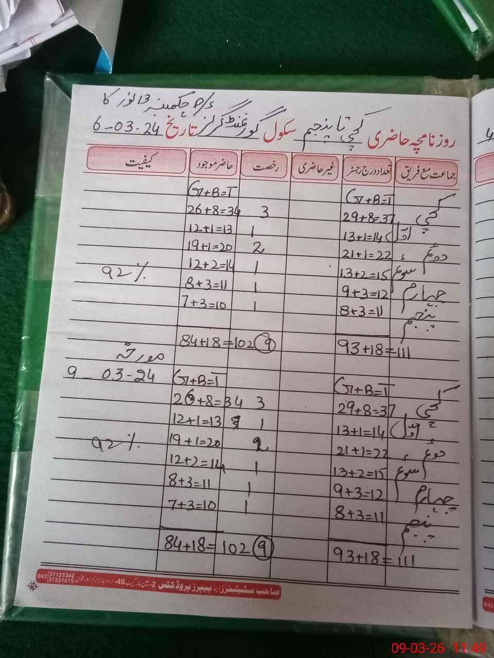 | Remarks (Use Separate Page if Required): Dangerous portion consisting of 02 rooms and 01 washroom is closed for teaching. FTF register not maintained for the month of Feb 26 do marked as record not shown. LND Result is English 80% Urdu 90% and Maths 100% | |||||