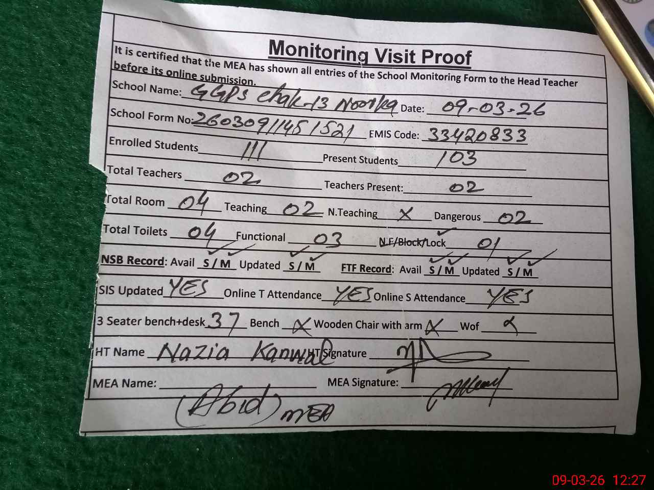 | EMIS Code: 33420833 | Name of School: GGPS CHAK NO 13 JB NOOR KA | |||