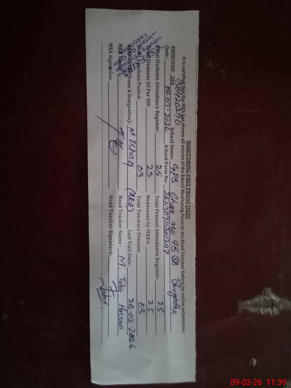 | Attendance Register | Head Teacher | MEA with School | Visit Proof |
