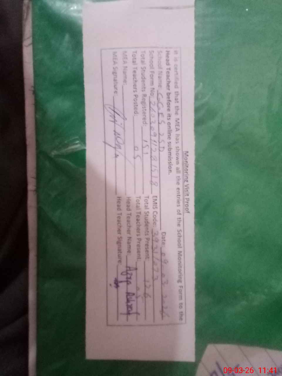 | Attendance Register | Head Teacher | MEA with School | Visit Proof |