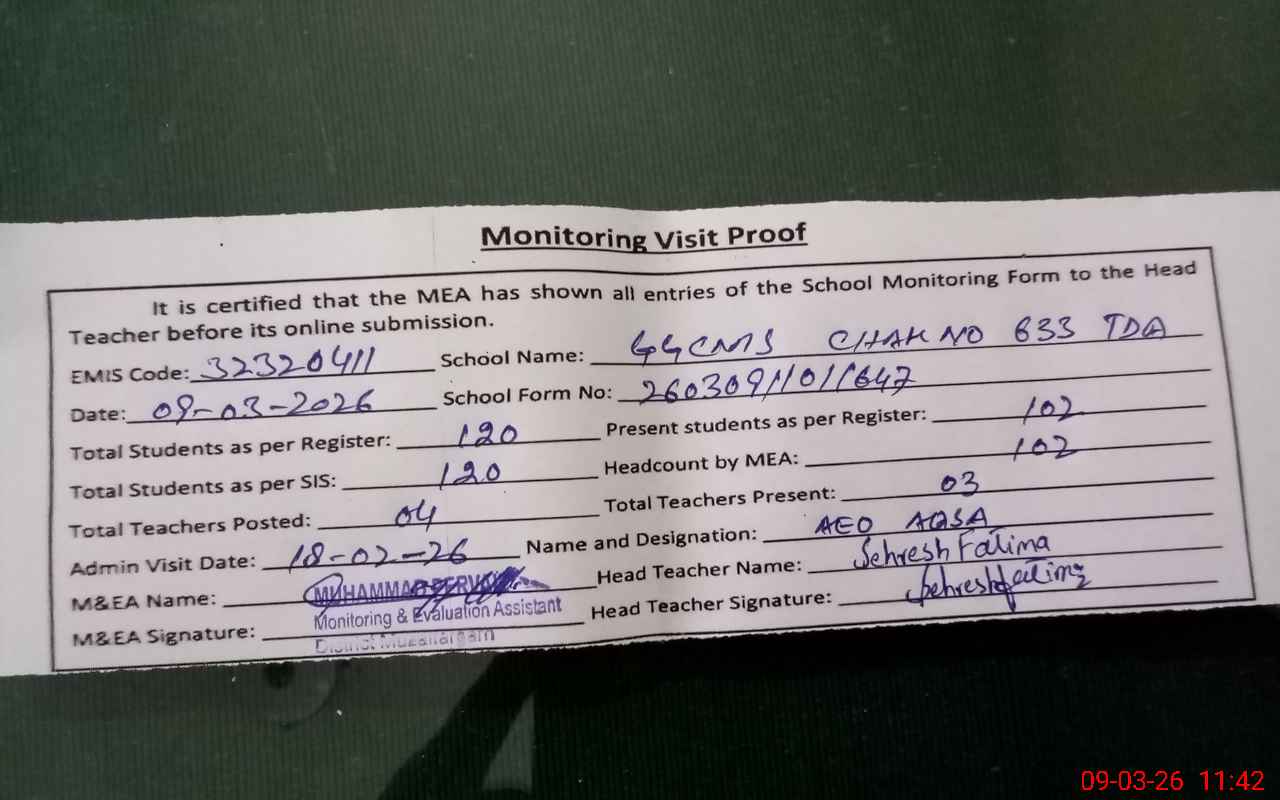 | EMIS Code: 32320411 | Name of School: GGCMES CHAK NO. 633/TDA | |||