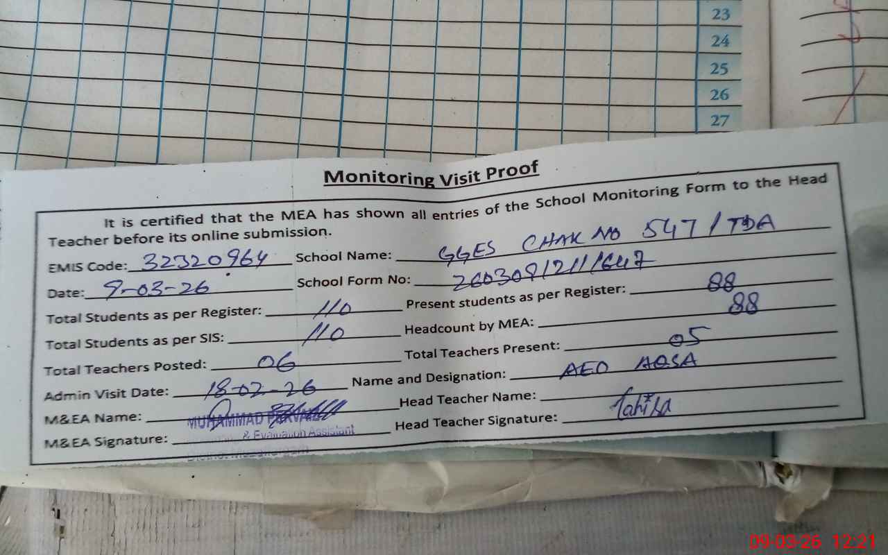 | Remarks (Use Separate Page if Required): NSB record and school council register not available in the school. Books record from D3 not available. GGES Chak No 547 functioning in the building of GGCMES Chak 633 TDA. Drinking water is unfit for use vide report no Lab No 21LYH/2025 dated 16-12-2025. No alternate action taken to provide healthy drinking water for students. | |||||