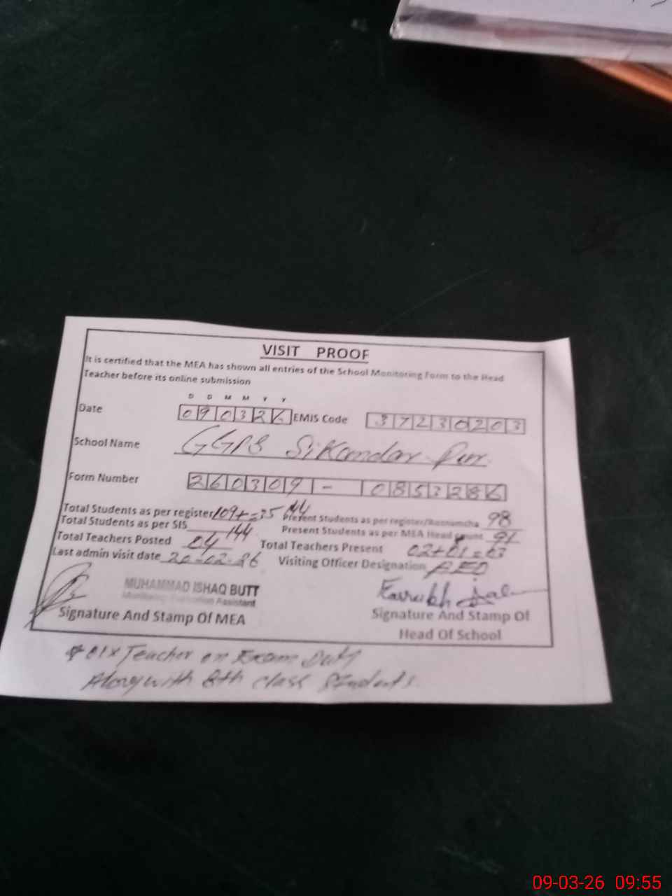 | Remarks (Use Separate Page if Required): one teacher name of Mehnaz Arshad went to Gghs bars gowa along with students for exam duty | |||||