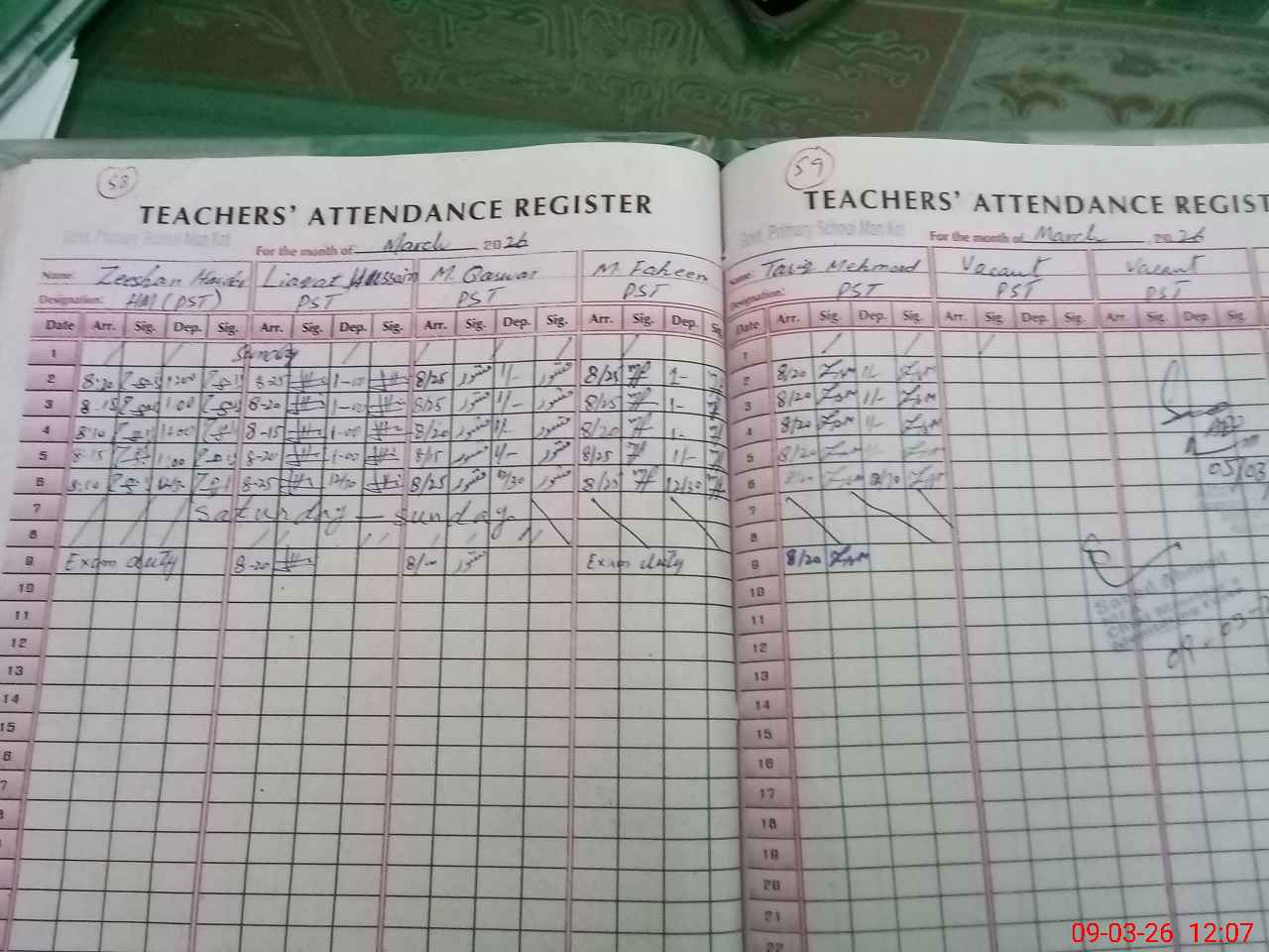 | 36**** | Mu**** Fa**** Sh**** | PST Arts | Regular | 0 | 0 | 0 | 0 | 0 | 0 | 0 | 0 | 0 | Exam Duty |