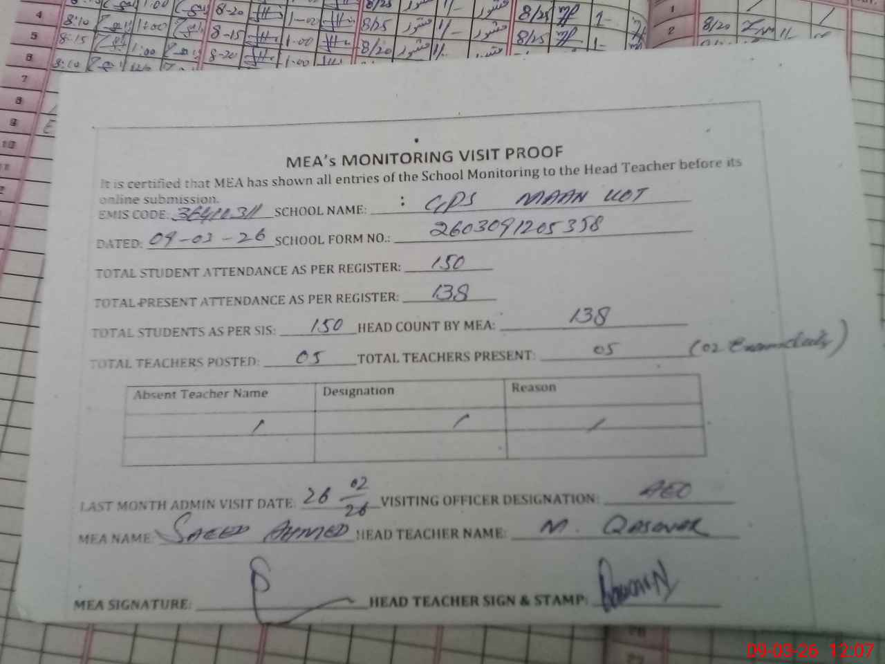 | Attendance Register | Head Teacher | MEA with School | Visit Proof |