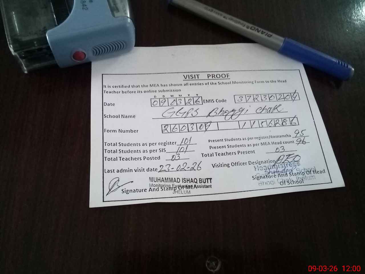 | Attendance Register | Head Teacher | MEA with School | Visit Proof |